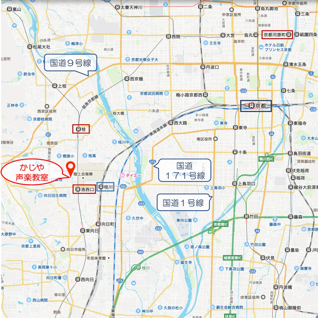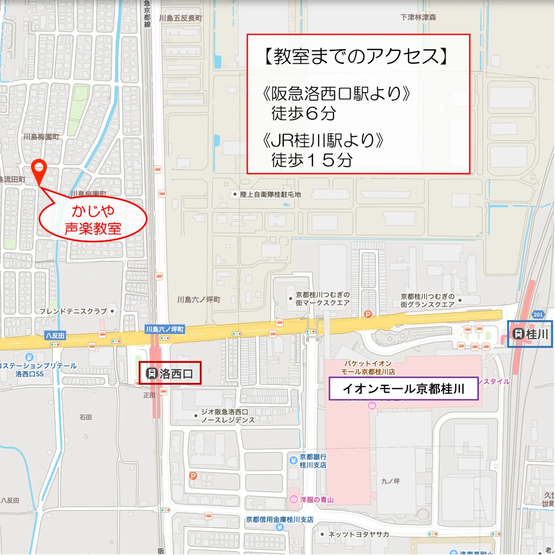 教室は「阪急洛西口駅」から徒歩6分、「JR桂川駅」から徒歩15分の場所にございます。